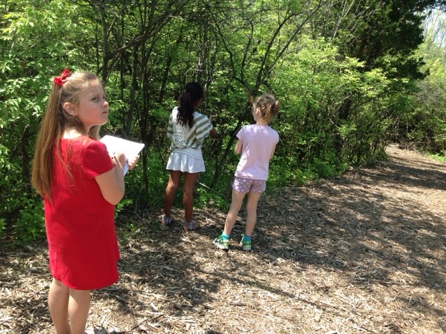 We've been exploring and learning about different types of poetry. One of the students' favorite types to write is concrete poetry (where the words of the poem create an outline/drawing of the topic). We walked the nature trail and spent time in the outdoor classroom observing and writing before students came inside and shared their poems.